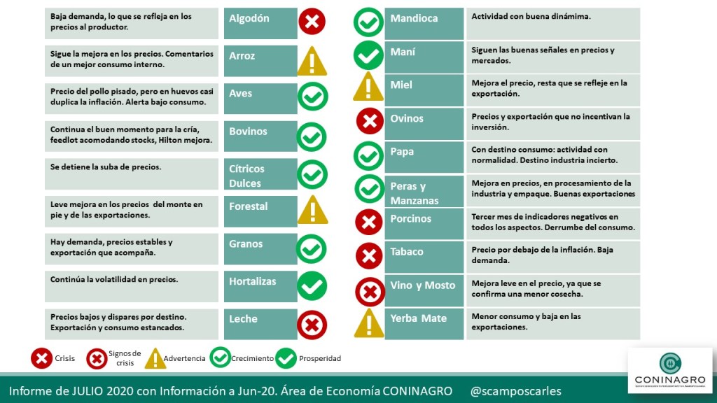 Como todos los meses, la Confederación Intercooperativa Agropecuaria (Coninagro) publicó el semáforo de las economías regionales para que el productor agropecuario pueda hacer un seguimiento de los indicadores que se analizan y busca simplificar la complejidad y heterogeneidad de la producción en el campo hacia una herramienta visual de análisis.