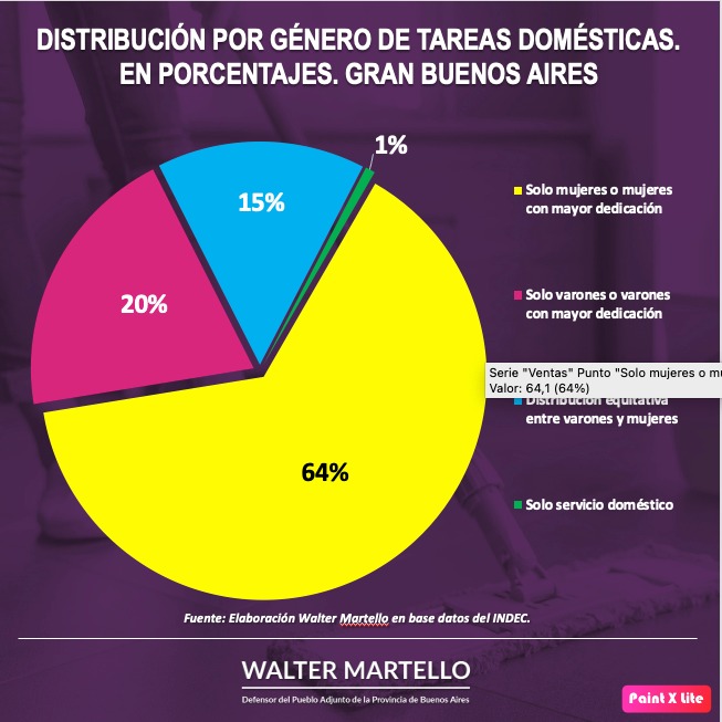 En ese sentido, de acuerdo a una investigación cuantitativa realizada por el organismo científico nacional, que abarcó gran parte del periodo de pandemia y asilamiento del año pasado, en el 64,1% de los hogares que aumentaron la dedicación a tareas domésticas, esas actividades fueron realizadas por las mujeres de manera exclusiva o con mayor dedicación (sin considerar los hogares unipersonales). Le siguieron los hogares donde esas tareas las realizan solo, o con mayor dedicación, los hombres, que representaron un 20,1%. En tanto, sólo en el 15,1% de los hogares se afirmó que hubo una distribución equitativa de las tareas domésticas entre mujeres y varones del hogar.