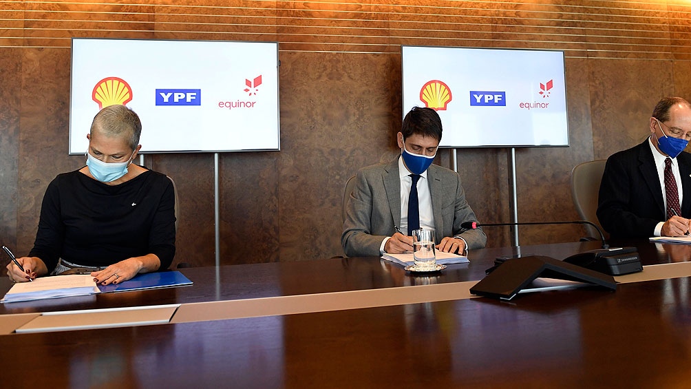Affronti suscribió el acuerdo con los presidentes de Shell Argentina, Sean Rooney, y de Equinor Argentina, Nidia Álvarez.